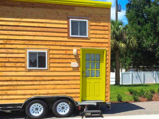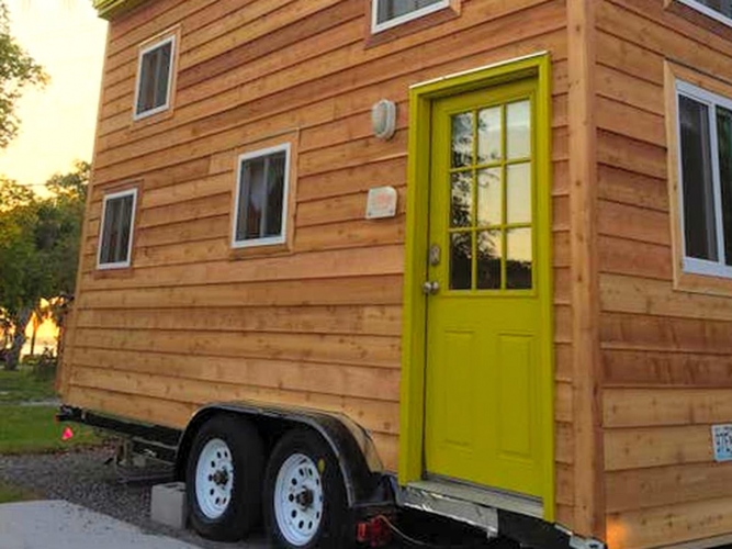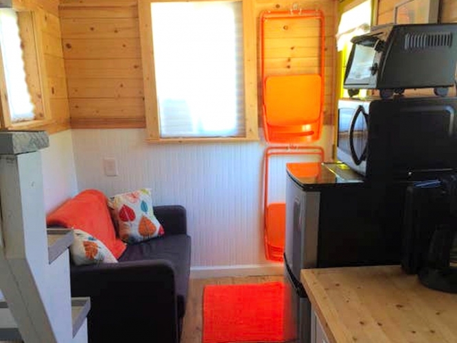 This amazing tiny house rental is the perfect rental for a weekend getaway near Lakeland, Florida. It can accommodate up to four in total and measures 160 square foot. The tiny house features a cozy loft space that is accessed via a ladder. The loft has a double mattress and a twin mattress. The remaining sleeping space is provided by the sofa bed. The bathroom features a shower, a sink, and a toilet.